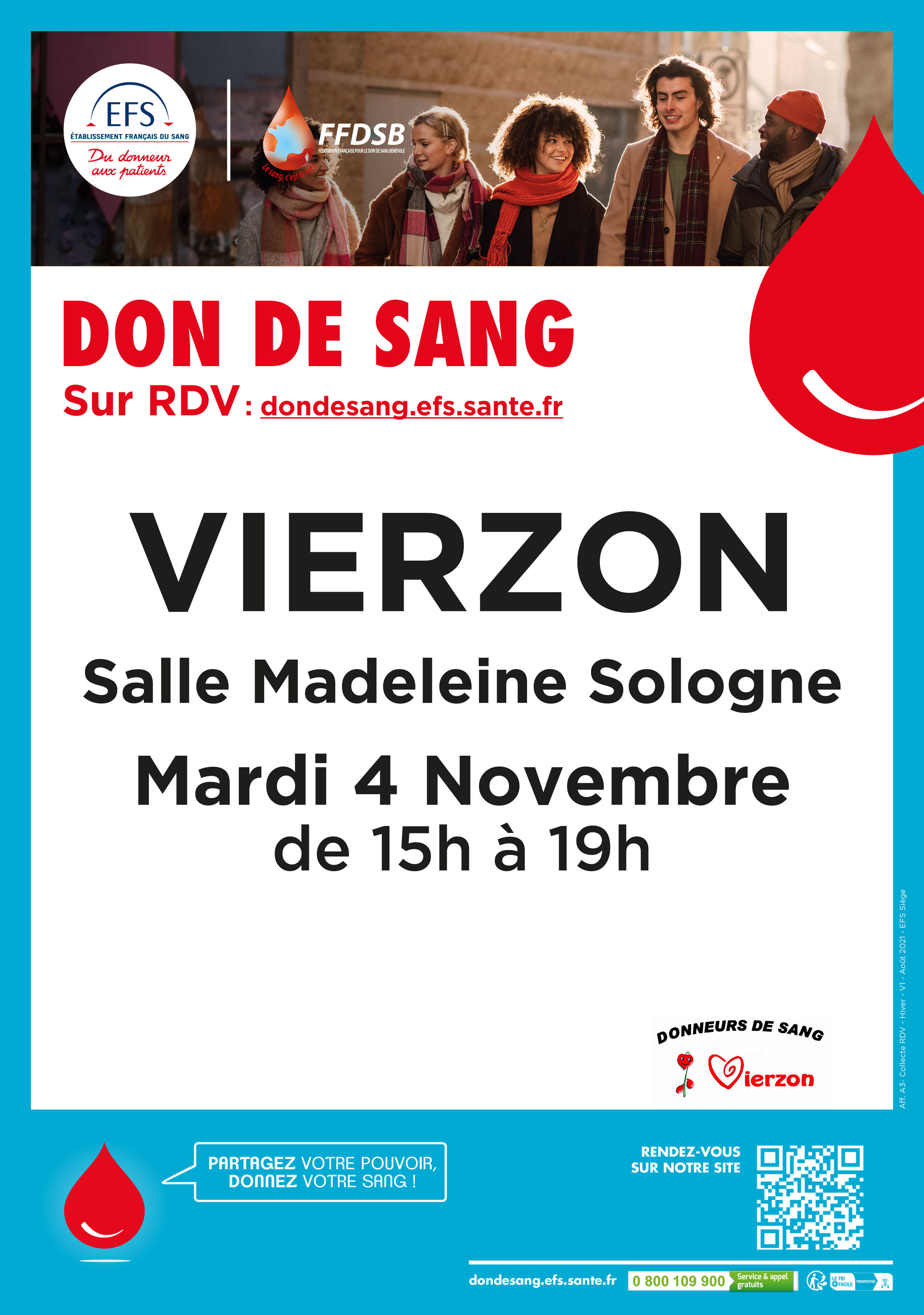 La prochaine collecte de sang à VIERZON aura lieu le Mardi 4 novembre de 15h à 19h à la SALLE MADELEINE SOLOGNE.