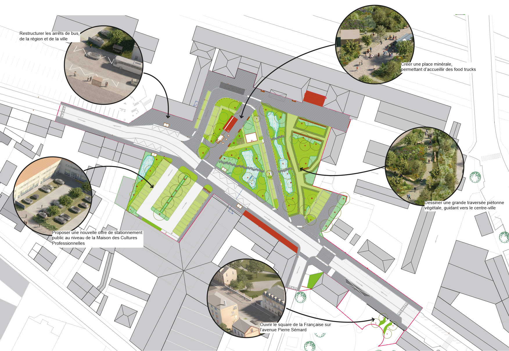 La volonté est de créer une continuité fluide entre la gare, le jardin de La Française, la place de la Société Française et le B3.